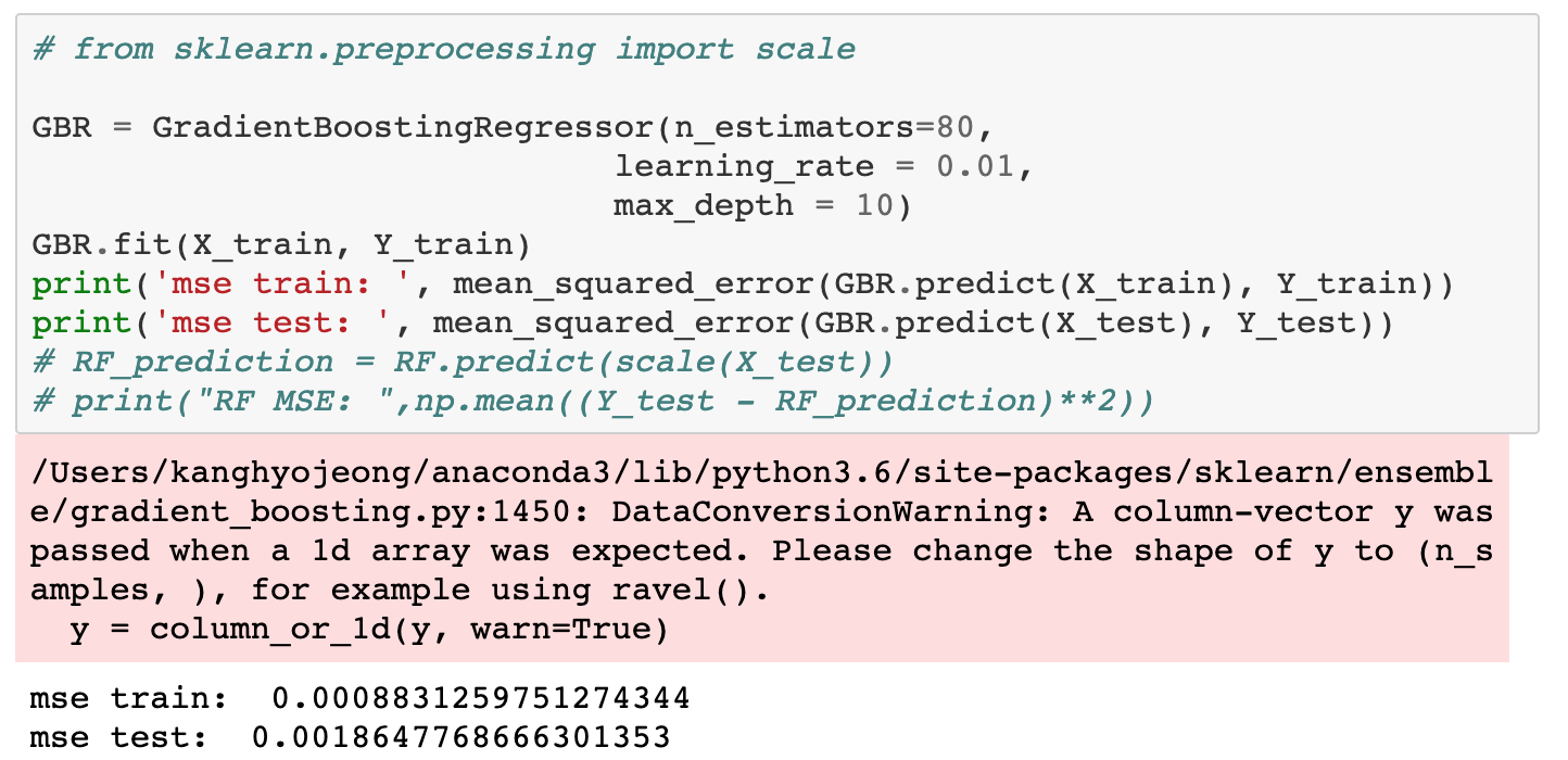 3-fold cross validation으로 파라미터 값을 설정하였고 그 결과 MSE는 0.001864가 나왔다.