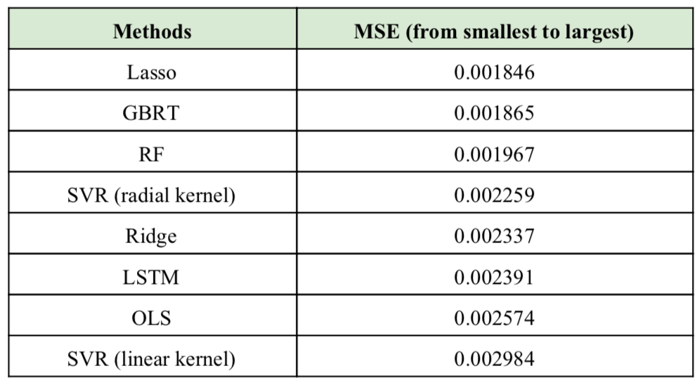 Lasso, GBRT, RF 순으로 예측률이 가장 높았다. 반면, 예측이 가장 낮은 모델은 SVR with linear kernel, LOS, LSTM이었다. 또한 앞서 알아본 feature importance를 종합해보면 가장 자주 언급된 treasury bill rates, stock variance, long term rate of return이 S&P 500 excess return을 예측하는데 있어서 가장 중요한 요소들이라고 할 수 있다.