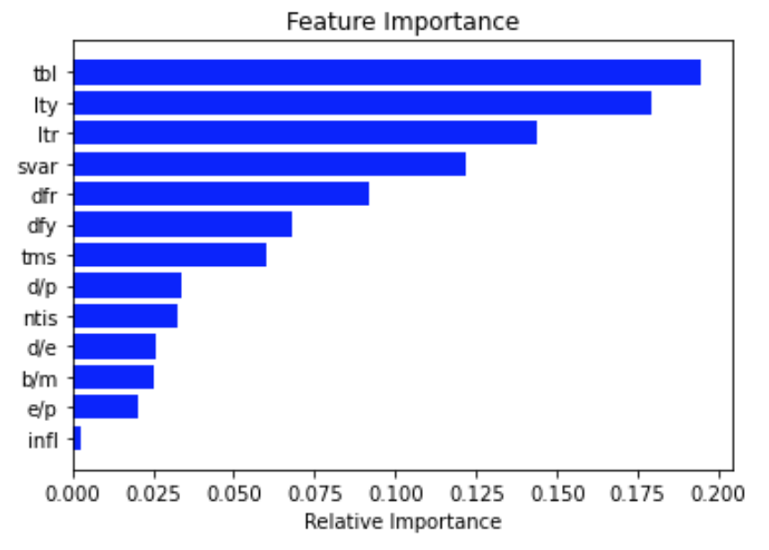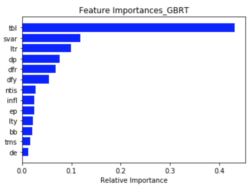 Feature importance에서 significant한 값은 tbl, svar, ltr, dp, dfr, dfy이다.
