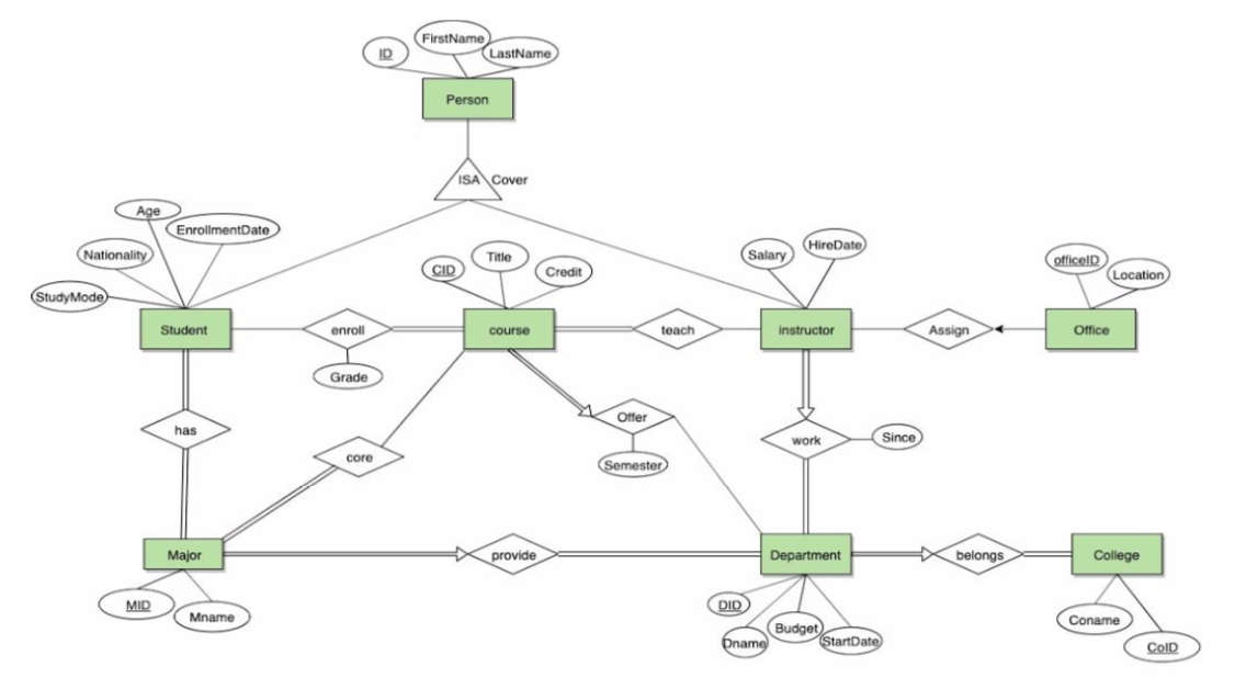 - course can only be offered by one departmentISA Hierarchy 는 students, instructors, 그리고 person entity 사이에 hierarchy를 형성하기 위해 사용하였다. Person은 logical sub-components인 students과 instructors로 구성되어 있다. Overlap contraints는 허용되지 않는다. 즉, Person은 동시에 instructor이면서 student일 수 없다. Covering constraints 또한 있다; 모든 사람들은 student 와 instructor 둘중에 하나에는 꼭 포함이 되어 있어야 한다.